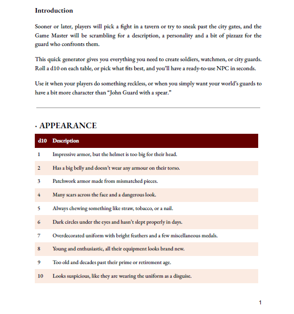 This quick generator gives you everything you need to create soldiers, watchmen, or city guards. Roll a d10 on each table, or pick what fits best, and you’ll have a ready-to-use NPC in seconds.