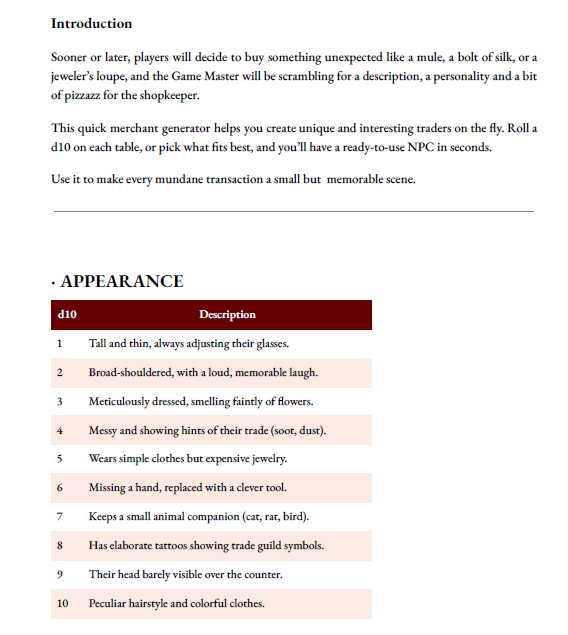 This quick merchant generator helps you create unique and interesting traders on the fly. Roll a d10 on each table, or pick what fits best, and you’ll have a ready-to-use NPC in seconds.