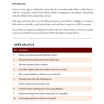 This quick generator gives you everything you need to create thieves, smugglers, or assassins. Roll a d10 on each table, or pick what fits best, and you’ll have a ready-to-use NPC in seconds.